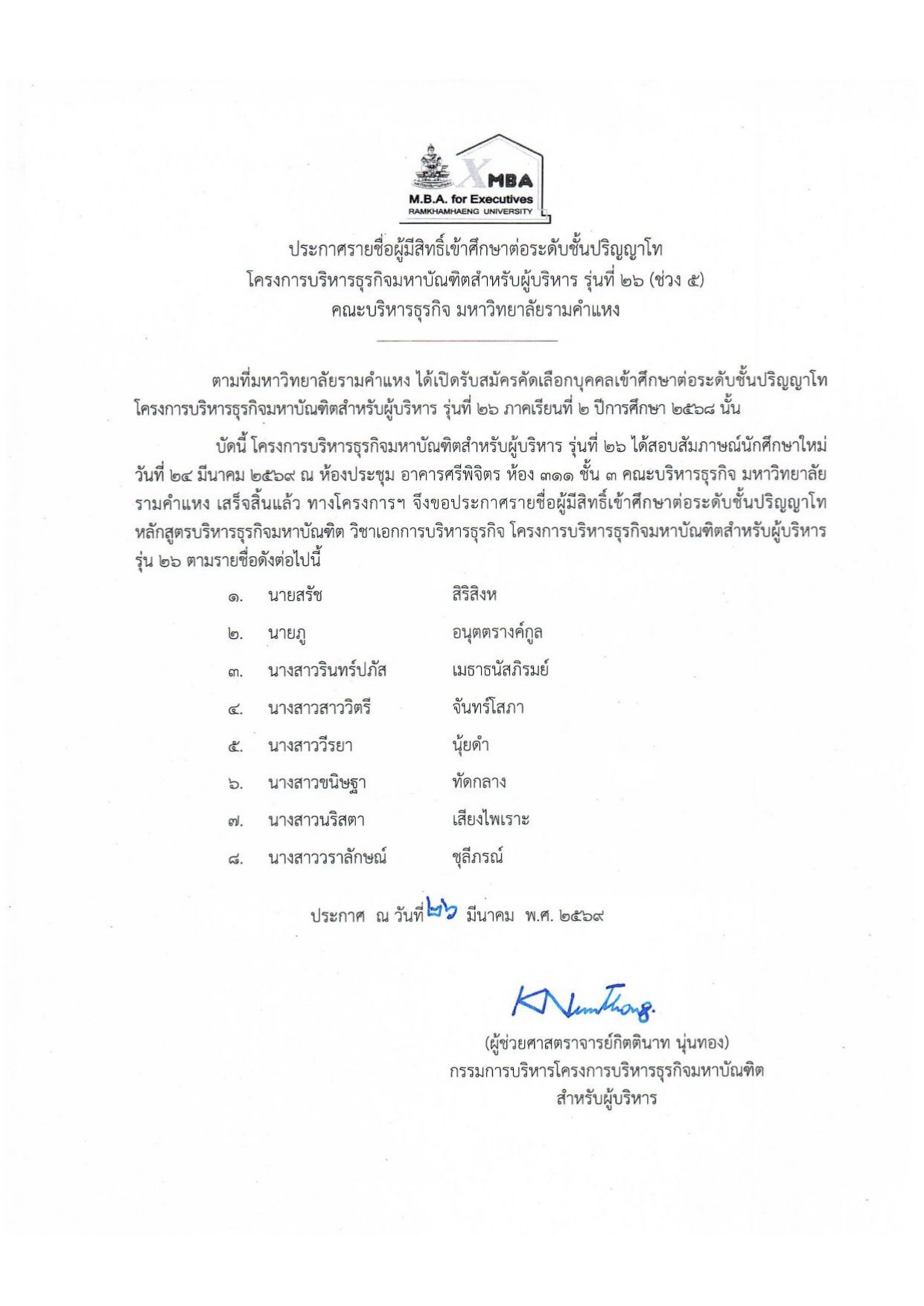 ประกาศรายชื่อผู้มีสิทธิ์เข้าศึกษา XMBA รุ่นที่ 26 (ช่วงที่ 5)